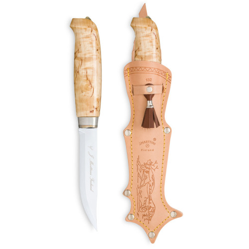 Нож MARTTIINI Lynx 132 имеет клинок из нержавейки с гравировкой, рукоятку из карельской березы и ножны из натуральной кожи. Длина клинка 11 см.