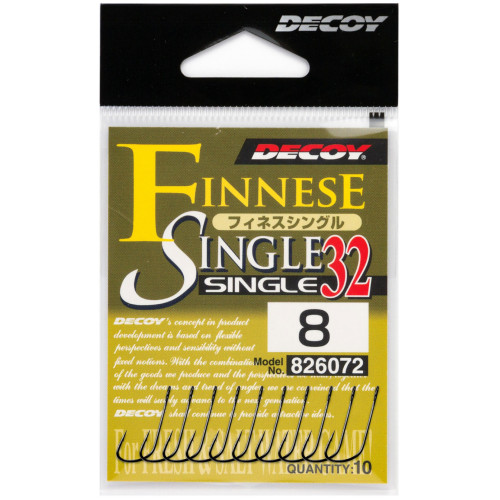 Крючок Decoy Finnese Single 32 используется для оснащения искусственных приманок, например, воблеров и блесен, а также для создания шарнирных монтажей для джига, часто используется для ловли саргана с применением бомбарді. Создан из прочной проволоки с антикоррозийным покрытием.