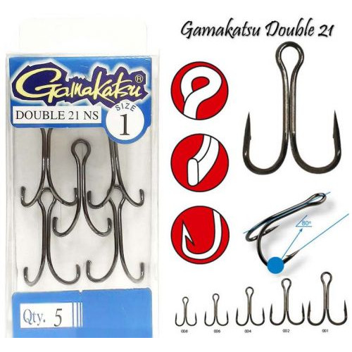 Gamakatsu Double 21 NS призначений для лову хижих риб. Використовується для різних оснасток з використанням живих і штучних насадок, а також для заміни трійників на різних приманках типу раттлінів, тейл-спіннерів, цикад, у разі, коли доводиться облавлювати придонні шари води з опуском приманок на дно. Заміна на донних приманках трійників на двійники забезпечує значно меншу зачіплюваність останніх на дні водоймища, при цьому також добре і надійно засікає рибу. Виготовлені з високоякісної сталі, дуже гострі та зносостійкі.