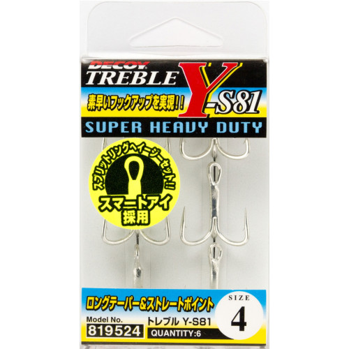 Крючок тройник Decoy Treble Y-S81 является особо прочным и подходит для оснащения спиннинговых приманок. Поддев имеет специальный изгиб, который не дает разогнуться крючку даже при вываживани особо крупных экземпляров. Ушко тройника имеет выемку, которая позволяет легко нанизывать заводные кольца на крючок. Антикоррозийное покрытие защищает крючок даже в соленой воде.