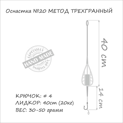 Оснастка "метод" Orange MF-20 Метод трехгранный 1кр применяется для ловли рыбы на водоемах со стоячей водой. Методная кормушка обладает отличными полетными качествами, а прикормка вымывается постепенно. Состоит из прочного поводочного материала небольшого диаметра с антизакручивающими трубочками, лид-кора, 1 крючка, на который можно крепить разные насадки. Оснастка не цепляется за растительность и коряги на дне.