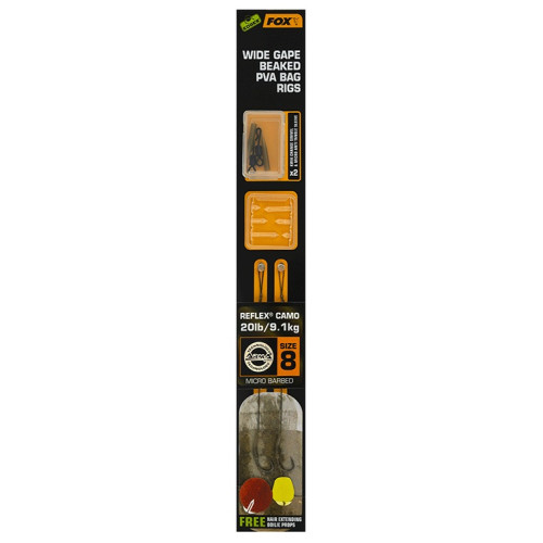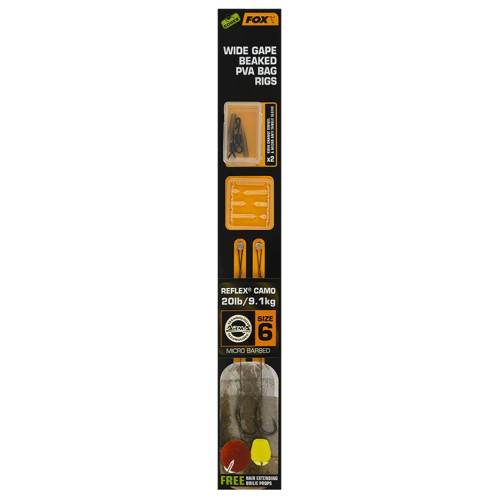 Оснастка "волос" FOX Edges Wide Gape Beaked PVA Bag Rigs изготовлены из поводкового материала Reflex с петлей на конце, оснащена крючком EDGES Wide Gape Beaked с широким зевом и загнутым внутрь жалом, дополнена вертлюгом-быстросъемником #7 и стопперами, укомплектована конусным антизакручивателем и лентяйкой. Оснастка предназначена для использования с ПВА пакетами.
