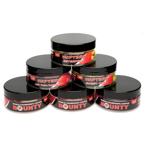 BOUNTY Wafters вафтерси з нейтральною плавучістю, виробляються дворазовими чемпіонами світу з коропового лову з натуральних інгредієнтів і мають підвищену поживність. У своєму складі вони мають знайомі коропа компоненти, які припадають йому до смаку і не викликають підозри, а також амінокислоти, мінерали, масляну кислоту, ферменти, вітамінний комплекс та ще безліч інших інгредієнтів корисних та улюблених коропами. А атрактанти викликають почуття голоду, надовго затримуючи рибу у місці лову. Фасовані в пластикову банку. В асортименті широкий ряд кольорів, смаків та два діаметри; 9*12мм, 10*14мм.