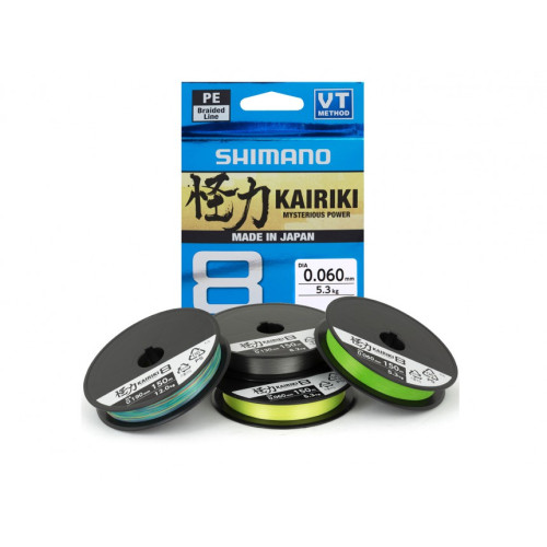 Kairiki - новий 8-жильний шнур, неймовірно слизький, міцний і стійкий до абразиву. Shimano, як і зазвичай, застосували нову технологію плетіння "VT construction Method". М'який, з прекрасними закидними харктеристиками, тихий і чутливий Kairiki чудовий для спінінга як у прісній, так і в солоній воді. Доступні чотири кольори; Mantis Green, Steel Grey, Yellow та Multi Color. Забарвлення Multi Color затребуване рибалками, що ловлять джигове і прямовисне оснащення на великих глибинах. Розтяжність не менше 3 відсотків.