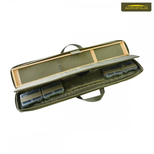РСП-2 - комплект из 5 коробок в мягкой сумке-футляре. Сумка изготовлена из водонепроницаемого прочного материала. В нее удобно помещается одна поводочница 70*10*4cm, внутри которой есть специальные шпильки для крепления поводков в натянутом виде. Также в сумке имеются 4 небольшие коробки 10.5*6.5*2.5cm, каждая из которых разделена на несколько ячеек 2, 3, 4, 8. Эти коробки можно использовать для хранения мелких рыболовных аксессуаров.