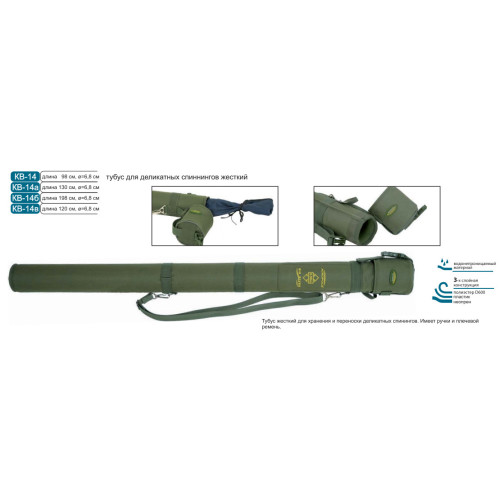 Тубус для удилищ Acropolis КВ-14 имеет пластиковый каркас и изготовлен из водостойкого полиэстера. Вмещает в себя 1 спиннинг. Чехол круглый в сечении и имеет диаметр 9 см, снасти внутри фиксируются затягивающимся креплением. Дно и крышка усилены материалом EVA.
